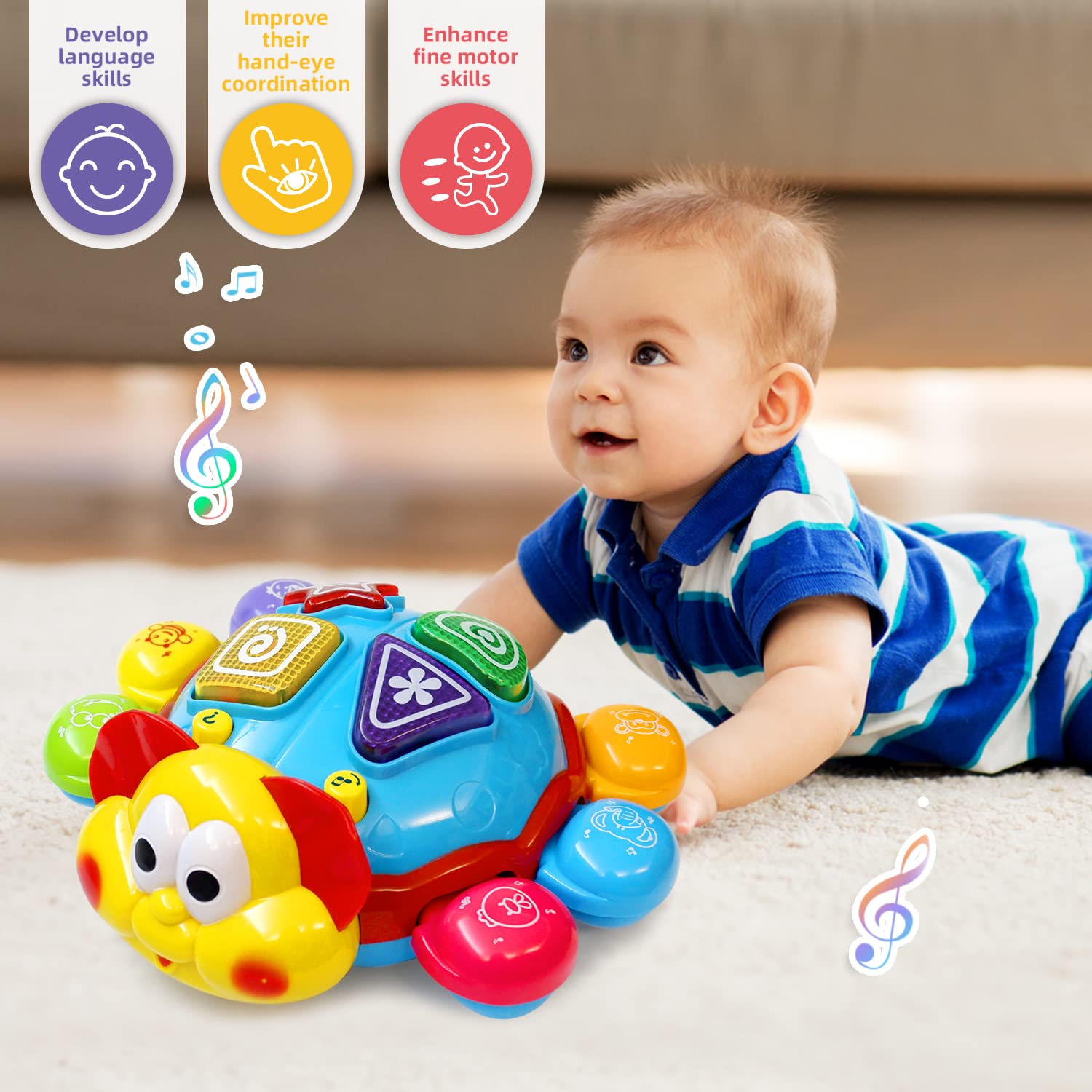 🧠 يعزز النمو المبكر - يدعم التنسيق بين اليد والعين، والمهارات الحركية الكبيرة، والتفكير السببي والخيال بينما يتبع الأطفال السلحفاة، ويضغطون على الأزرار، ويرقصون على أنغام الموسيقى.