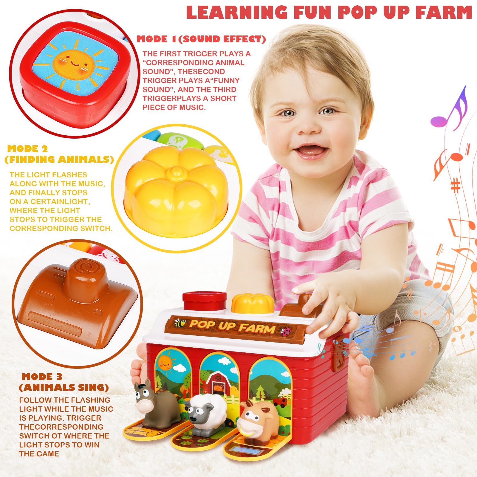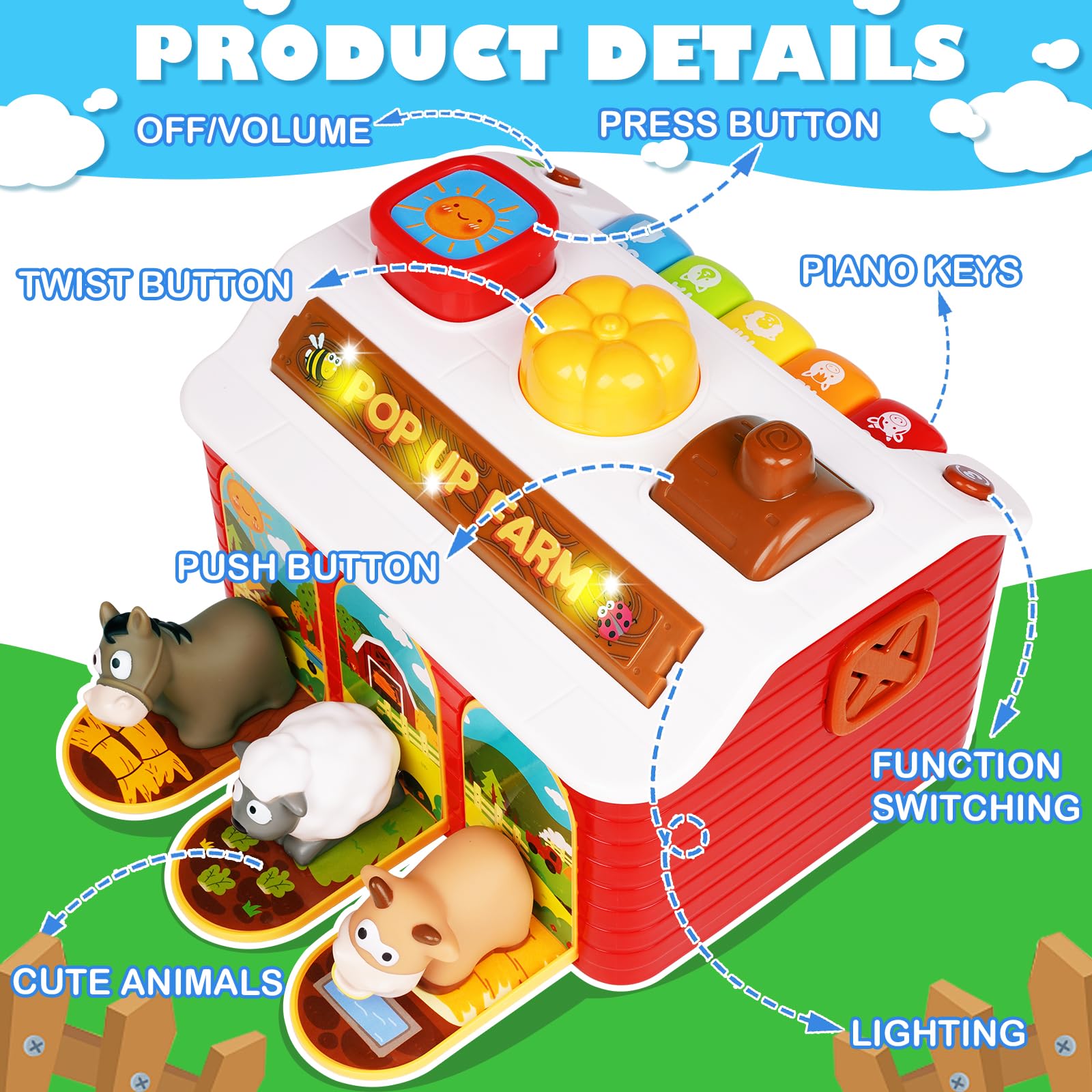 🎶 ثلاثة أوضاع تعليمية مرحة - وضع المؤثرات الصوتية يشغل أصوات الحيوانات والأصوات المضحكة والألحان القصيرة؛ وضع البحث عن الحيوانات يستخدم أضواء وامضة لإرشاد الأطفال إلى المفتاح الصحيح؛ وضع غناء الحيوانات يحول الحظيرة إلى لعبة موسيقية.