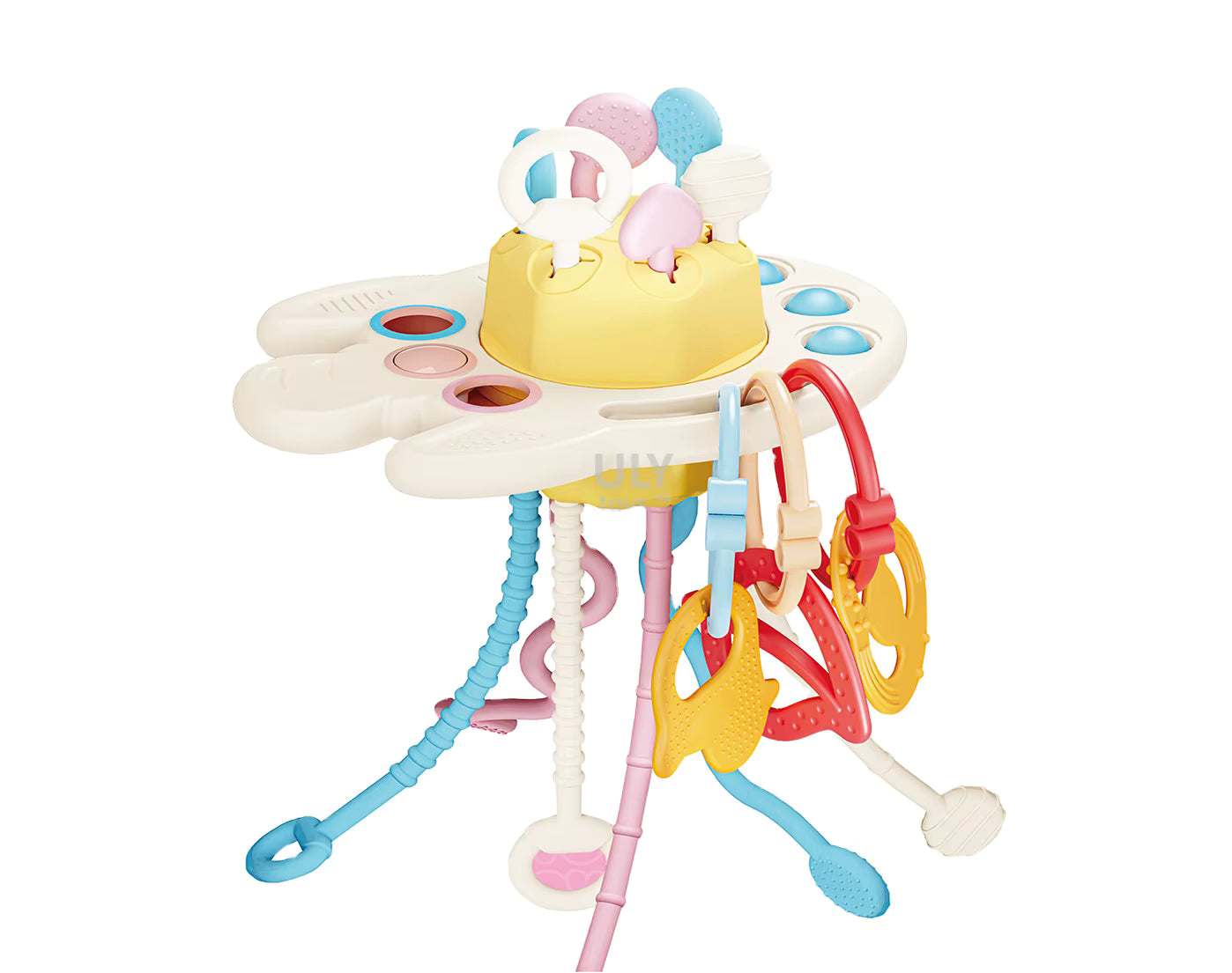 🌈 صديق النشاط الحسي الشامل – لعبة لطيفة بخيط سحب مع العديد من الحبال الناعمة وأزرار الضغط وعضاضات معلقة تُبقي الأطفال مشغولين في مقعد السيارة أو عربة الأطفال أو كرسي الطعام.