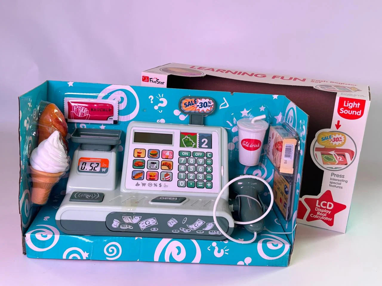 📦 تتضمن ماسحًا ضوئيًا محمولًا باليد، ونقودًا للعب، وملحقات طعام حتى يتمكن الأطفال من مسح العناصر ضوئيًا، والضغط على الأزرار، وحساب إجمالي طلب كل عميل.
