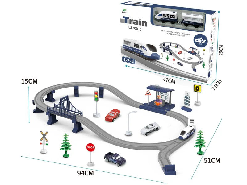šŸš†Ā 62-Piece Train Playset – Includes an electric train, track pieces, bridges, cars, trees, signs, traffic lights, and more for a full city-building experience.